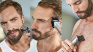 Use the metal trimmer with DualCut technology without a comb to get clean, sharp lines around your beard, neck and hairline, or to trim your body hair to a minimum length.